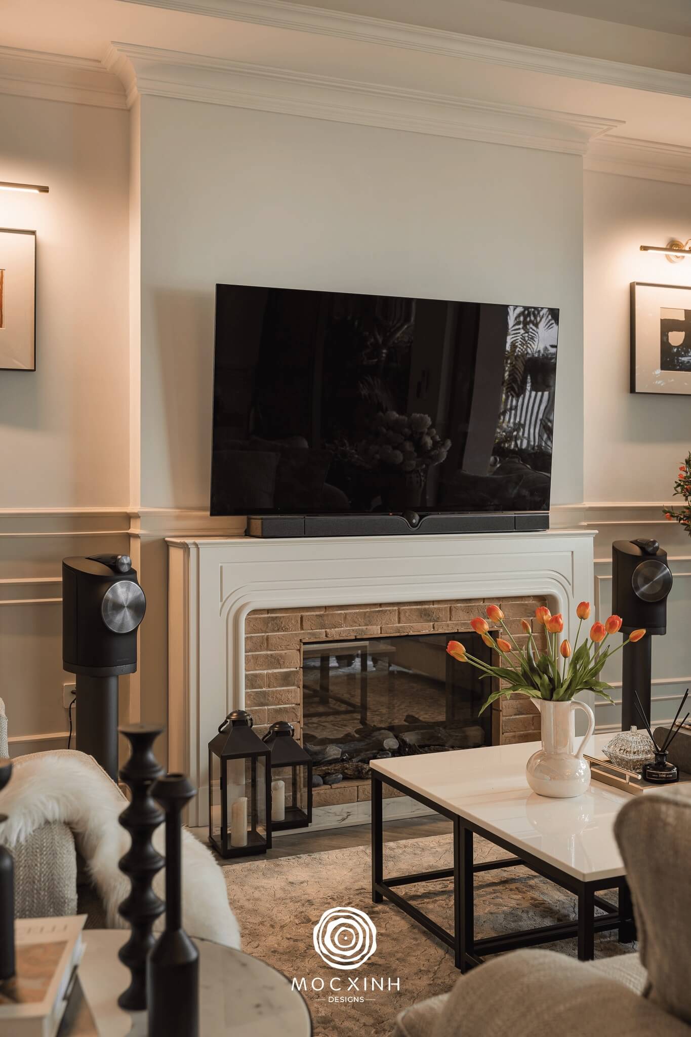 Phong cách Bắc Mỹ mang hơi hướng mộc mạc còn được thể hiện qua phần lò sưởi lát gạch thô, thảm lông vintage sợi ngắn và những bình hoa trang trí.