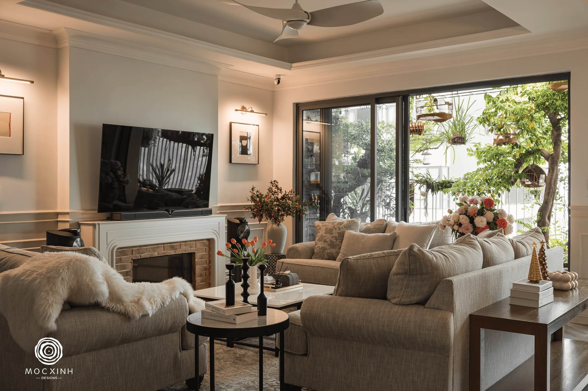 PHÒNG KHÁCH: Không gian mở được thiết kế với tone màu trung tính và nhã nhặn tạo cảm giác gần gũi, thoáng đãng.