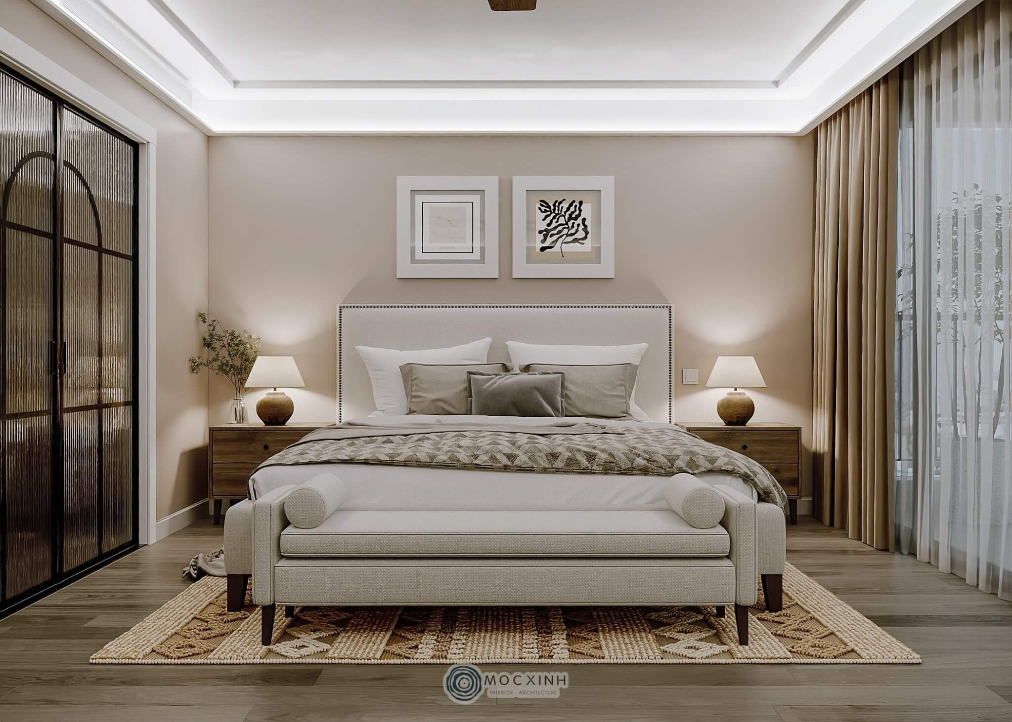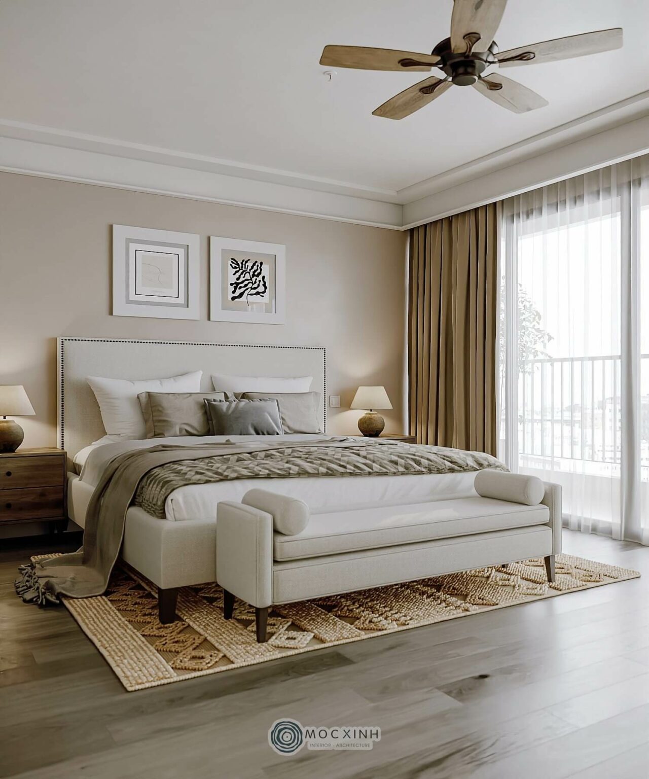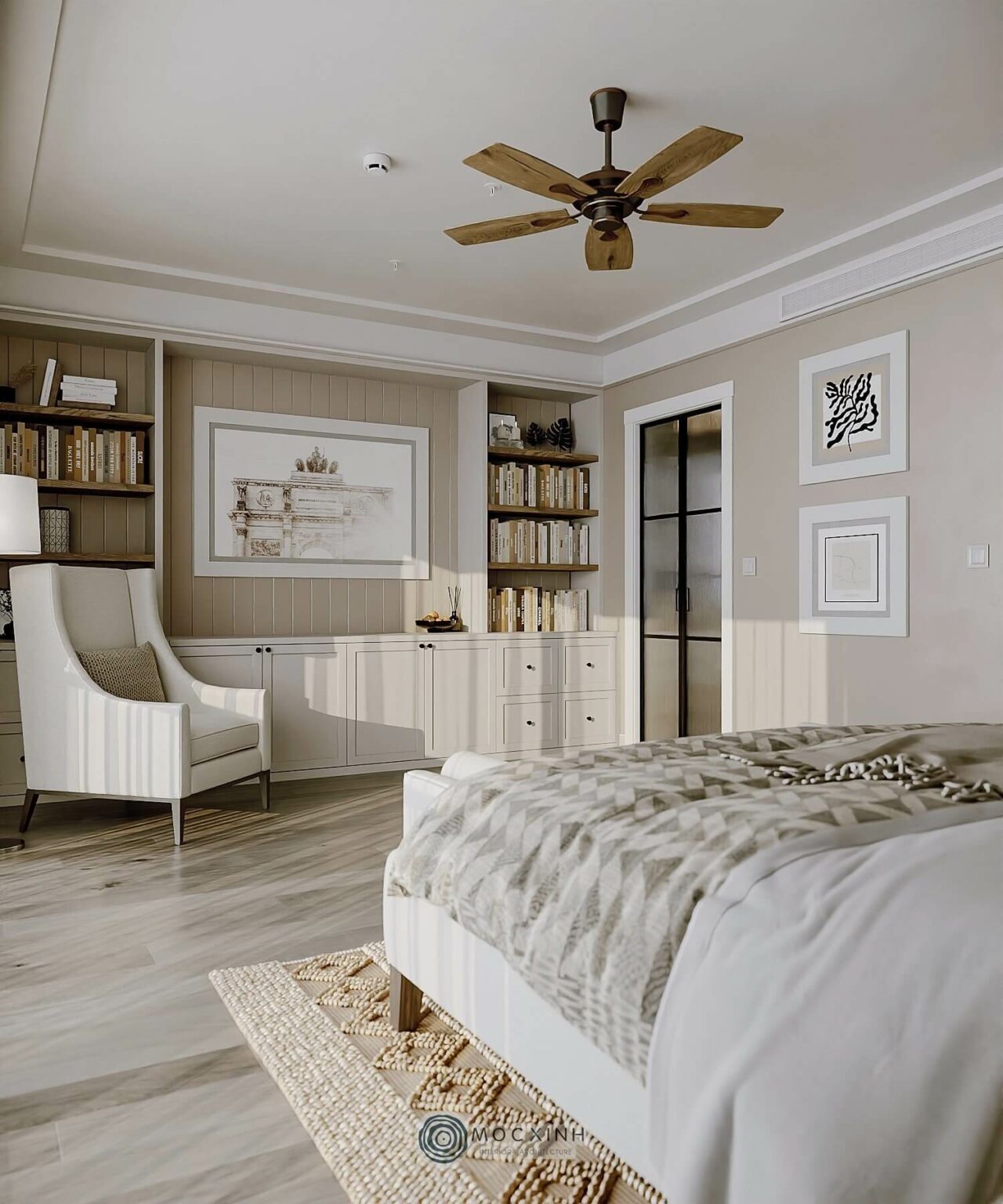 Không gian phòng ngủ master được thiết kế tập trung vào cảm thức an yên chảy trôi trong từng chi tiết như giường, đèn ngủ, quạt trần, thảm trải sàn, kệ để đồ…