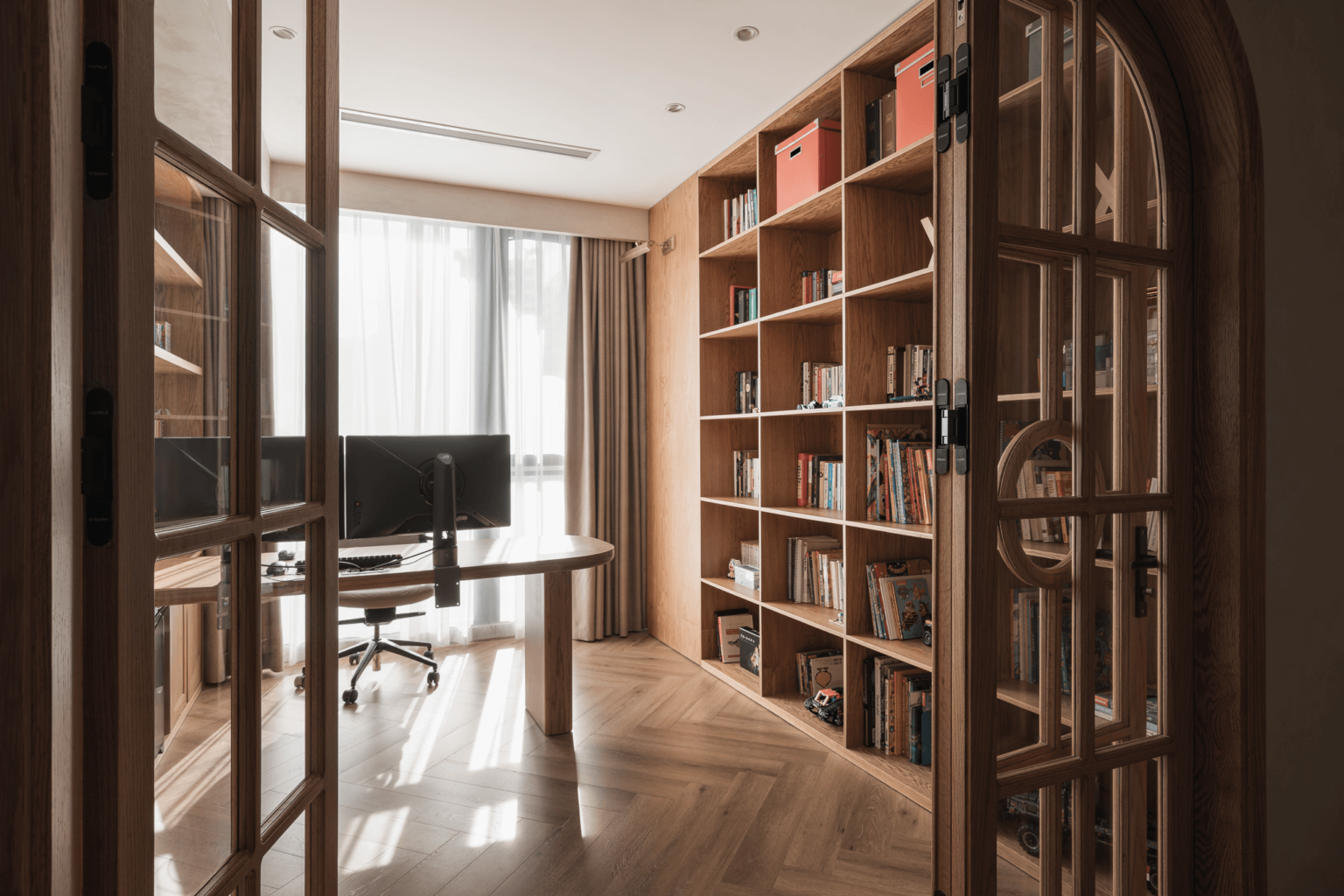 Đón lấy những ánh sáng rực rỡ nhất của ngôi nhà, phòng làm việc được thiết kế với bố cục bàn làm việc đối diện cửa sổ và các diện đường được bố trí kệ sách. Đây là nơi chứa đứng nguồn tri thức vô cùng rộng lớn của gia chủ với đa dạng các thể loại sách từ văn học kinh điển, triết học, lý luận…