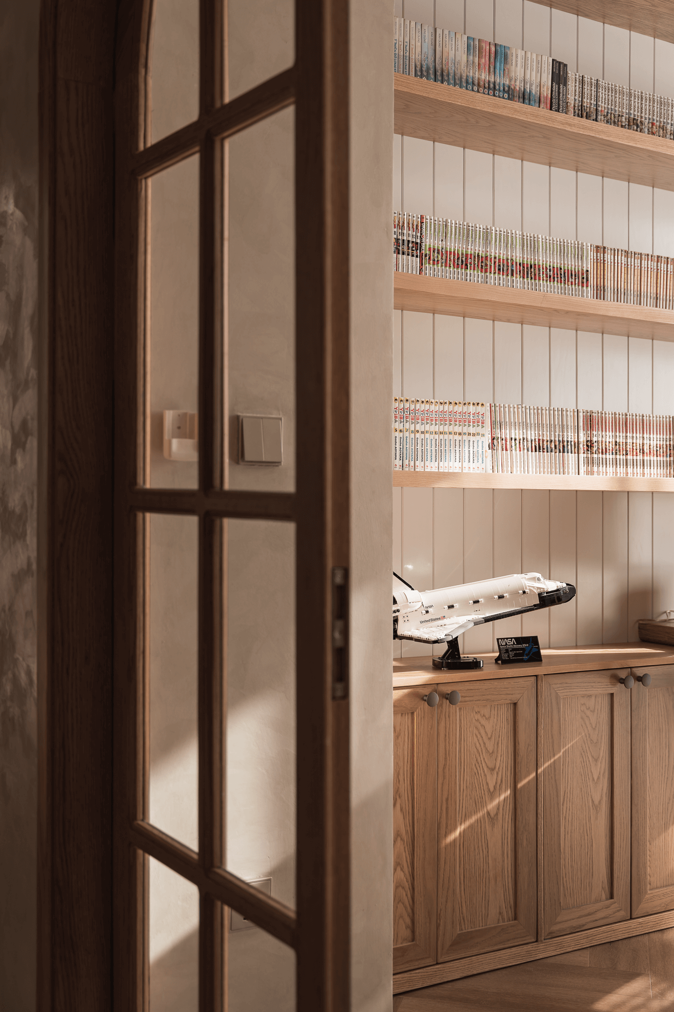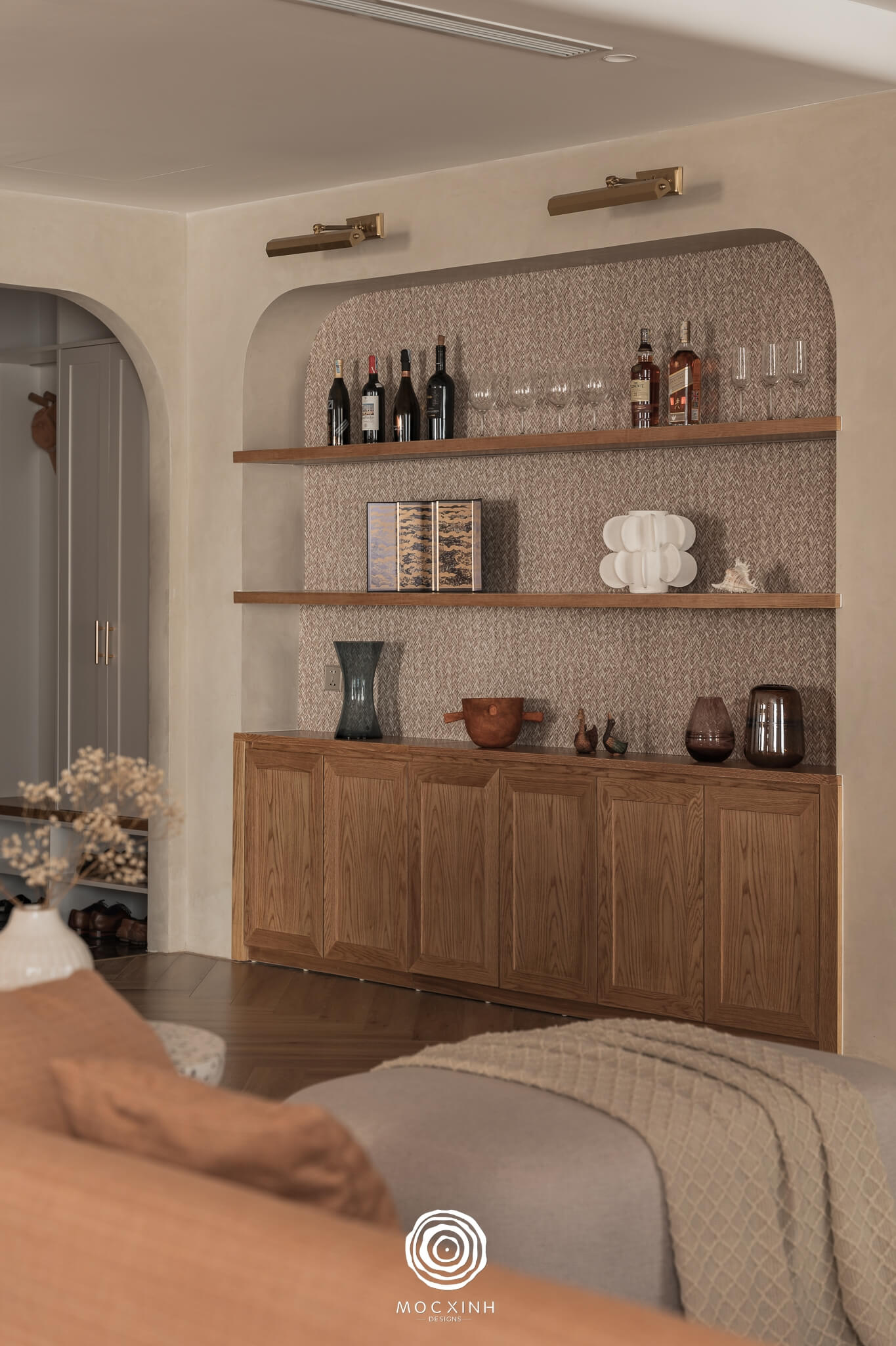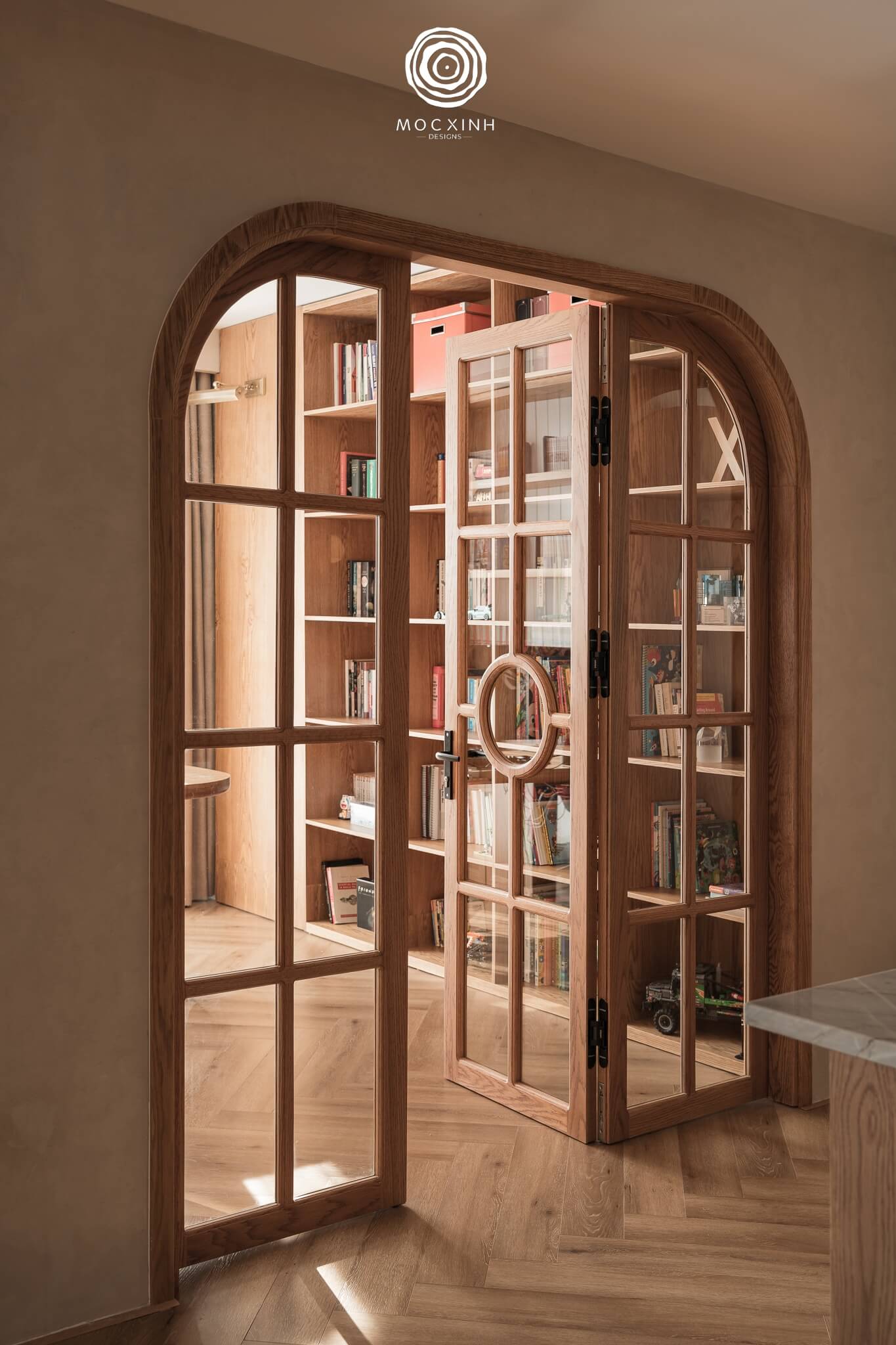 Các KTS đã thiết kế cửa vòm bán nguyệt với đường cong mềm mại nhịp nhàng cùng phong cách bình yên của không gian.