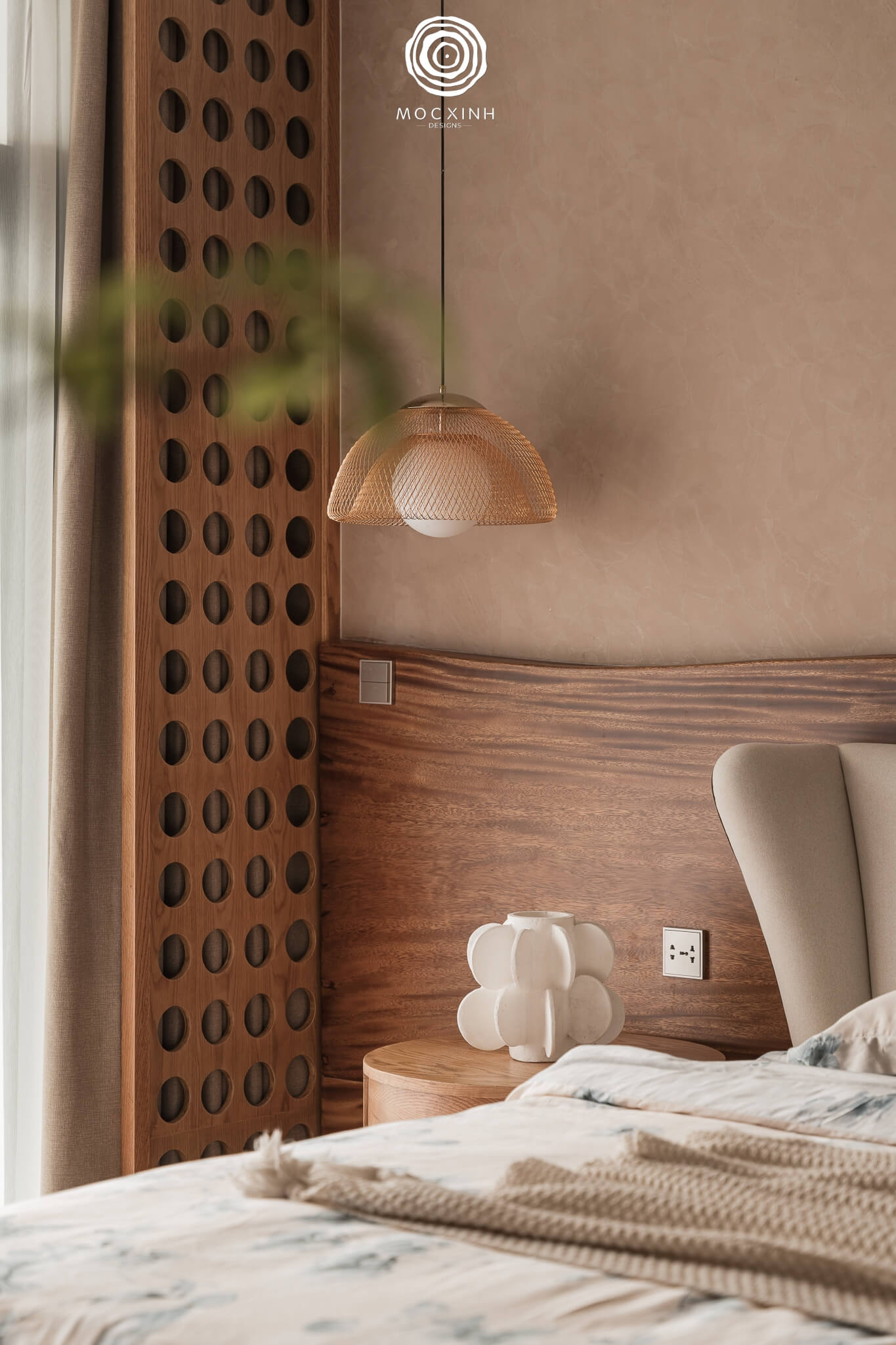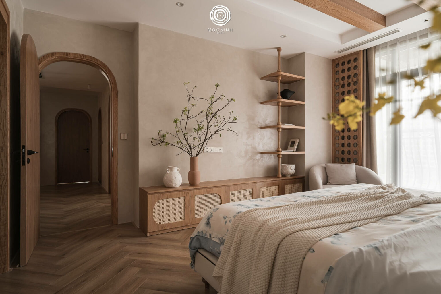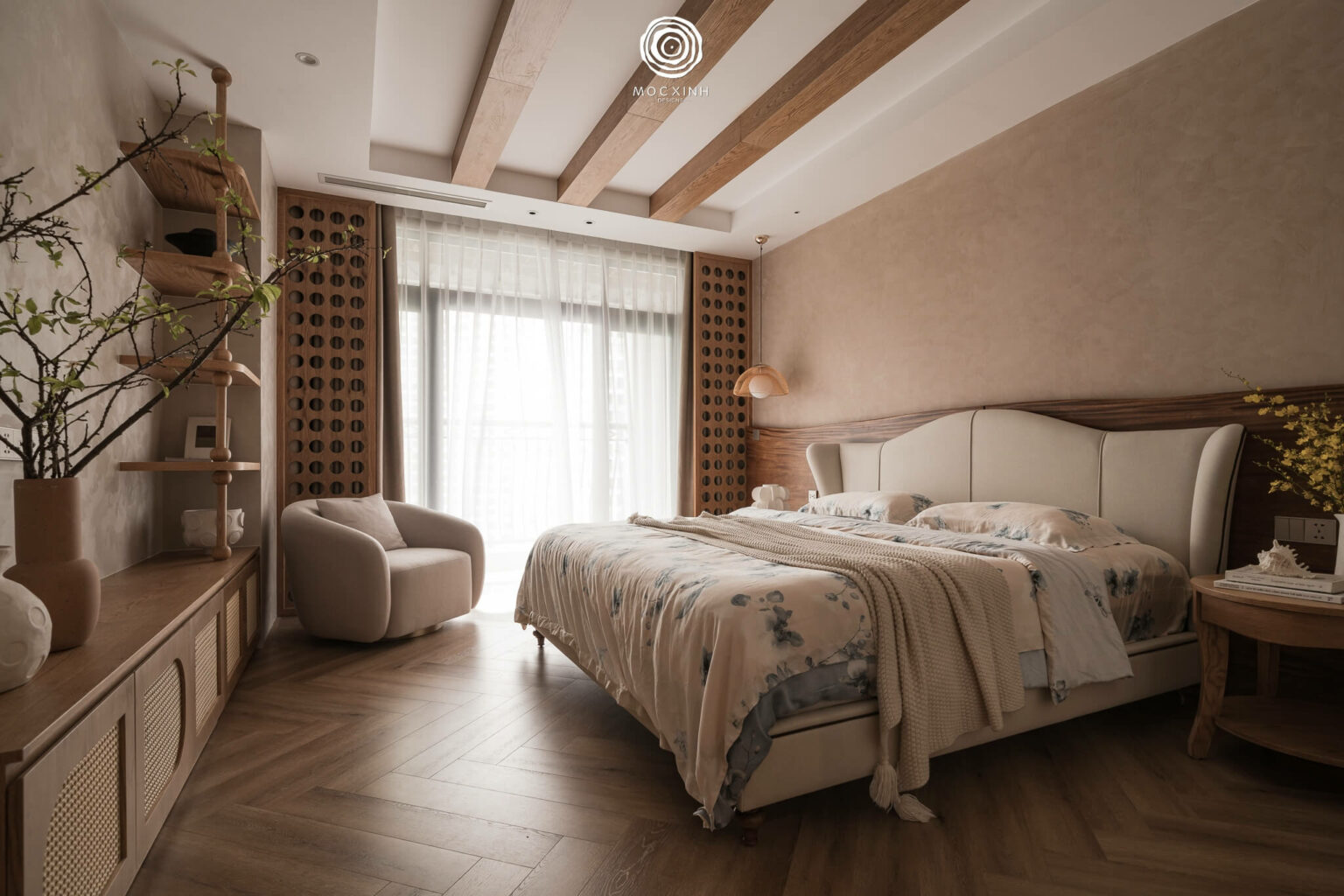 Không gian ngơi nghỉ sử dụng những tone màu beige, nâu hài hòa; thiết kế vách gỗ dâu nguyên tấm, hệ lam trần cổ điển và kệ tủ gỗ plywood phủ veneer sồi Mỹ. Các chi tiết bình hoa trang trí xen kẽ trong phòng ngủ tạo cảm giác như thiên nhiên đang len lỏi giữa không gian.