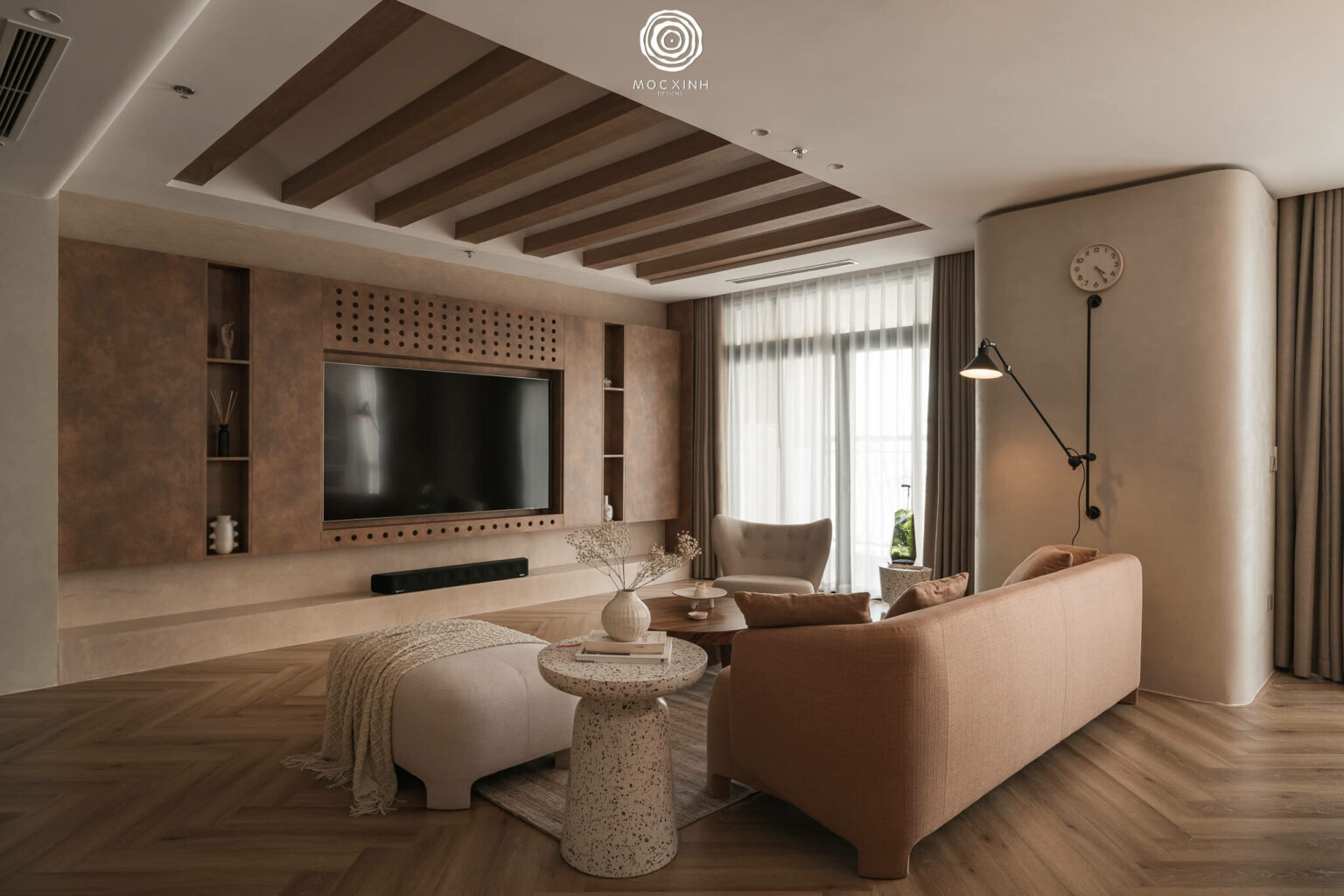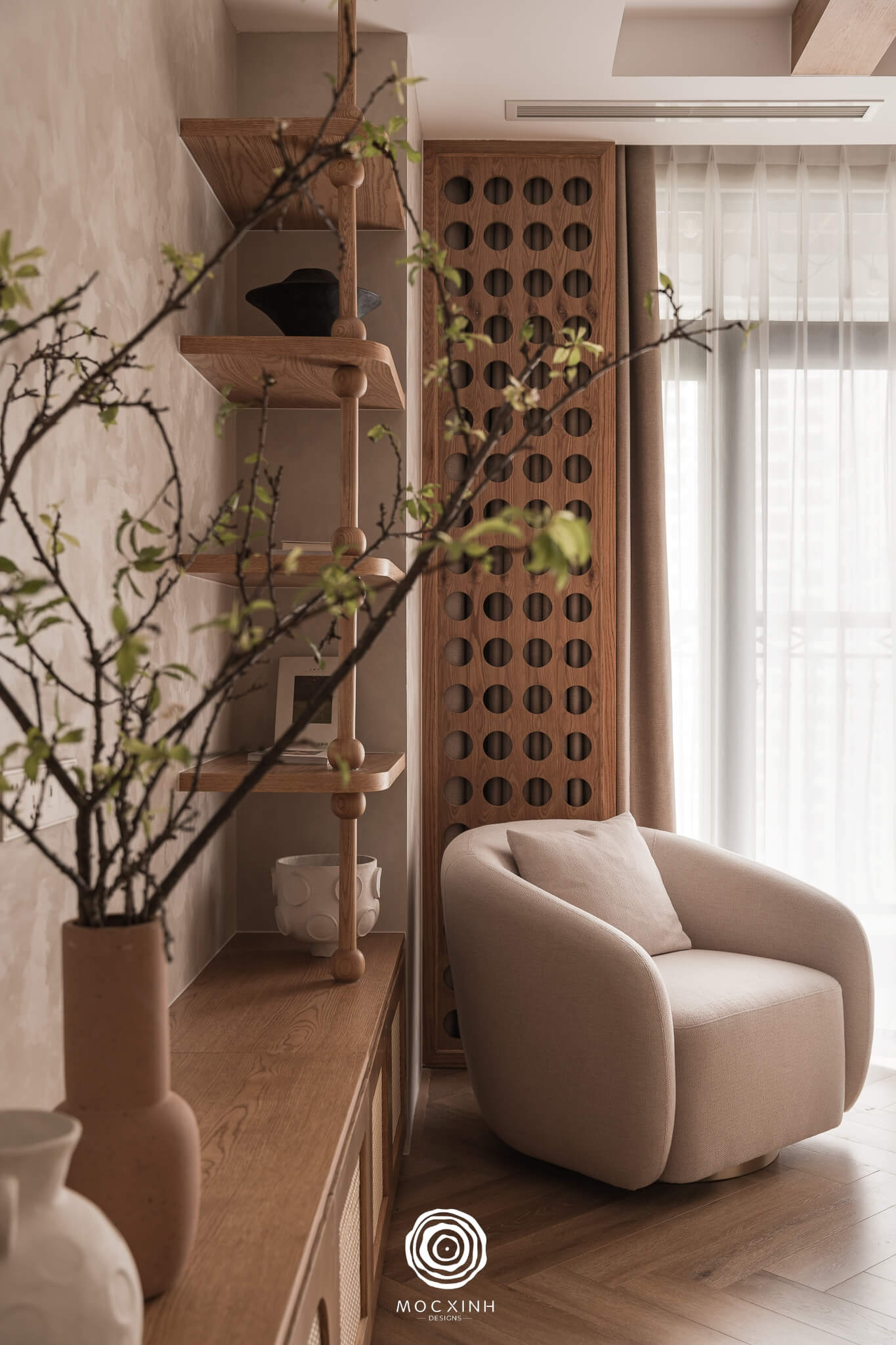hông gian phòng khách được “may đo” trong cảm thức an yên với chất liệu gỗ và các thiết kế đặc trưng của phong cách Wabi Sabi – Japandi.