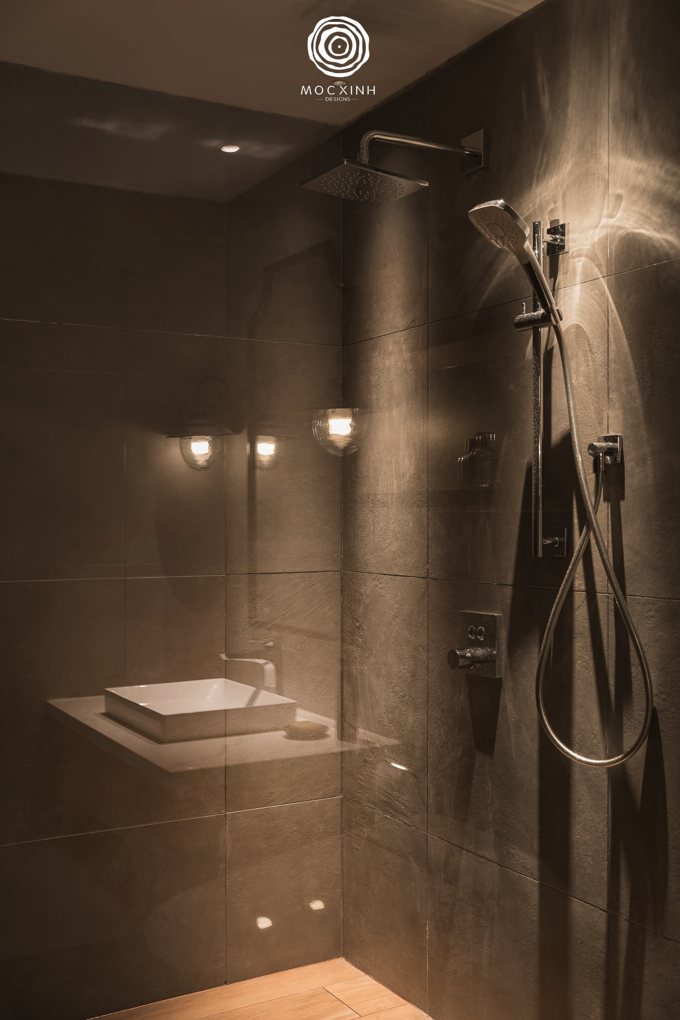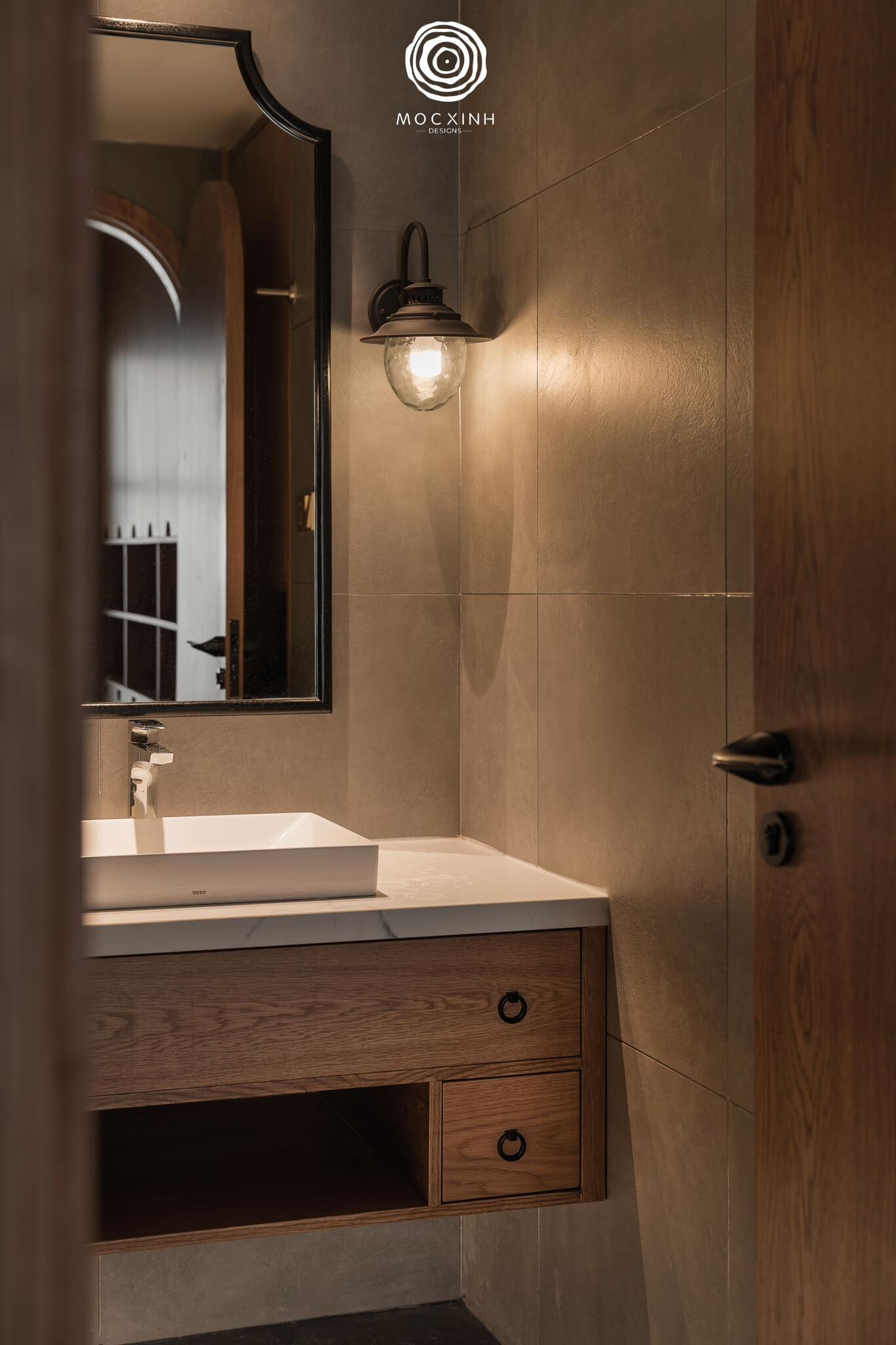 Nội thất phòng tắm đơn giản với màu sắc trầm kết hợp gạch lát tường kích thước vừa, hệ tủ để đồ bằng gỗ hay chi tiết đèn cổ điển.