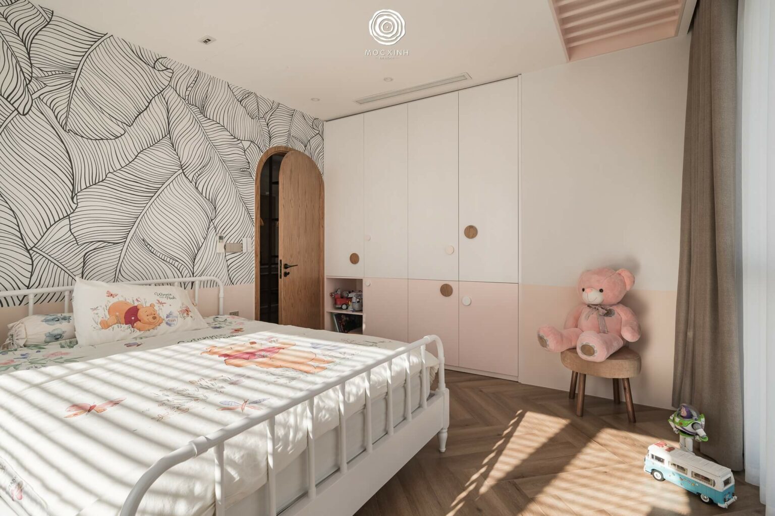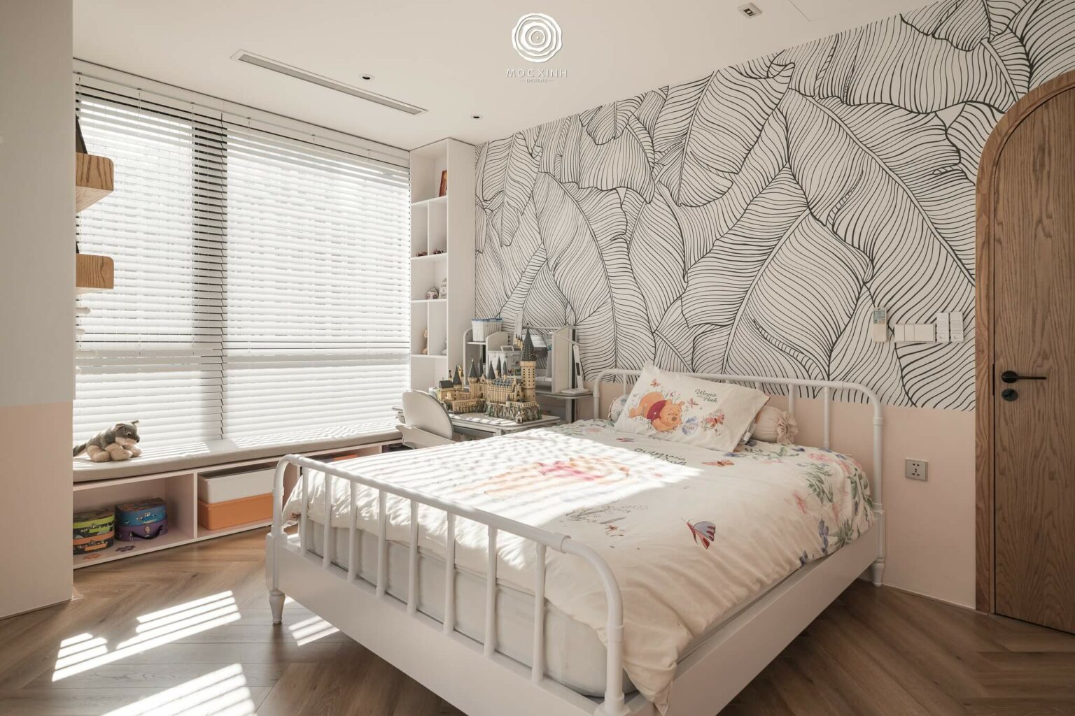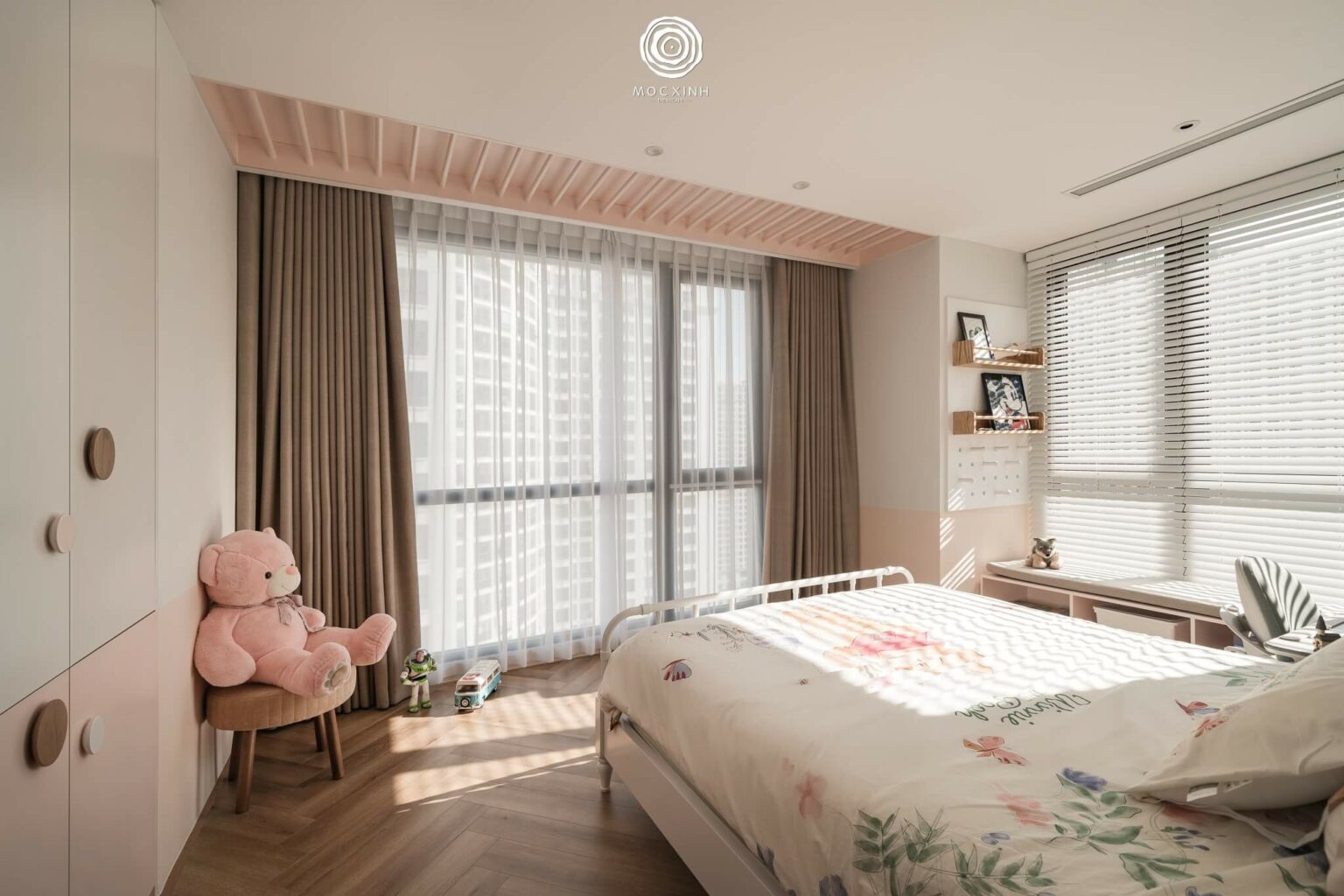 Không gian phòng ngủ trẻ em được thiết kế theo tư duy tinh giản và linh hoạt hơn. Vẫn là cửa sổ lớn với ánh sáng chan hòa, nhưng với các chi tiết nội thất sáng màu, phòng ngủ được mở rộng ra và bừng sức sống.