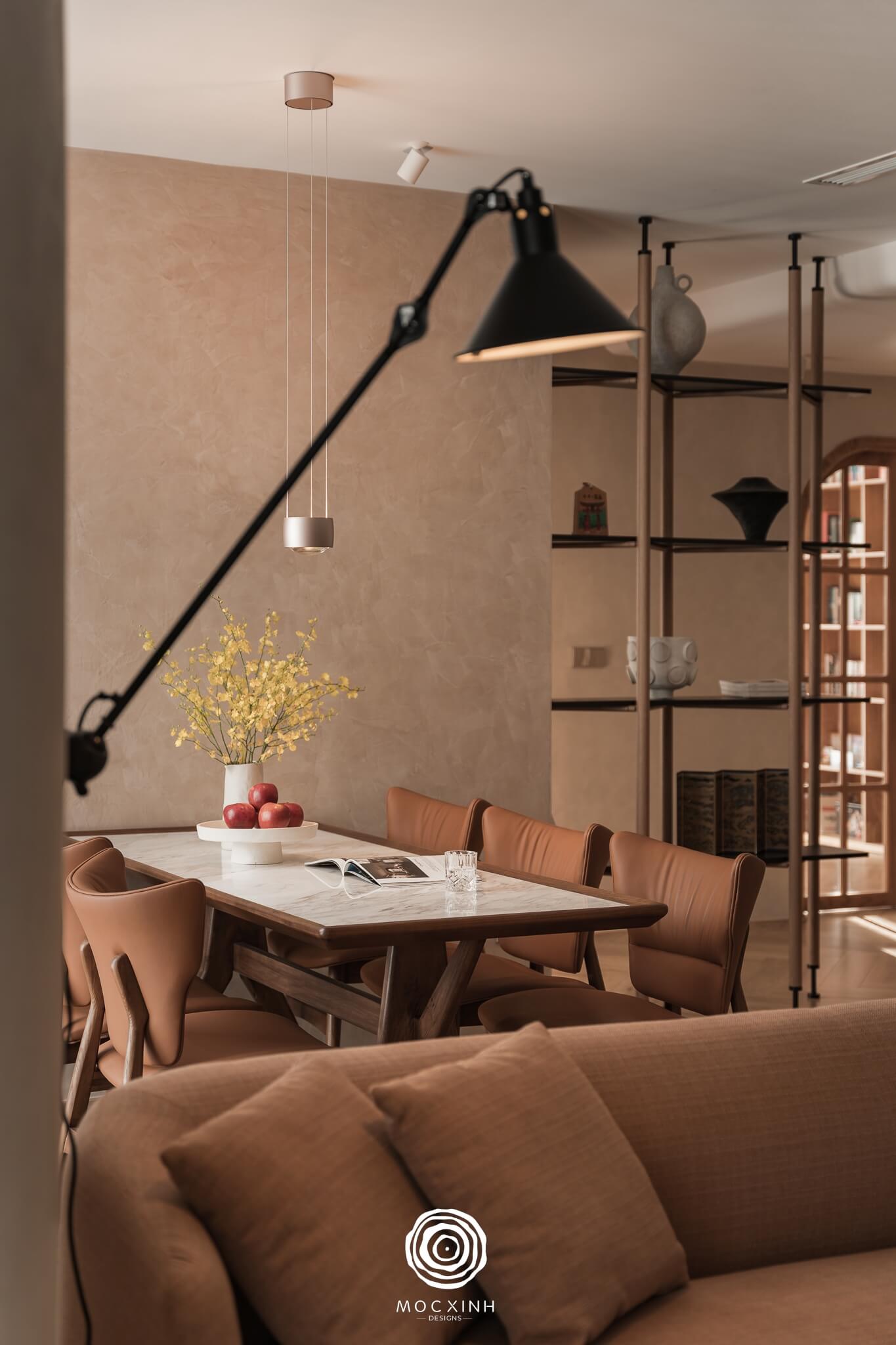 Hài hòa trong tinh thần thô mộc của căn bếp chính là không gian ăn uống. Phần bàn ăn thiết kế đương đại được nhấn nhá thêm với mặt đá cẩm thạch sạch sẽ và sang trọng.