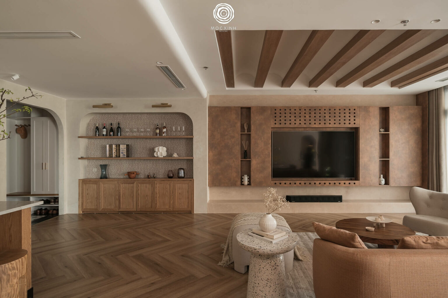 Đối với dự án thi công căn hộ Royal City 150m2, xu hướng nội thất bền vững được ứng dụng nhịp nhàng trong không gian sống. Xuyên suốt từ các phòng chính đến các không gian phụ, Mộc Xinh đã sử dụng hai phong cách Wabi Sabi và Japandi để nổi bật xu hướng nội thất bền vững cho công