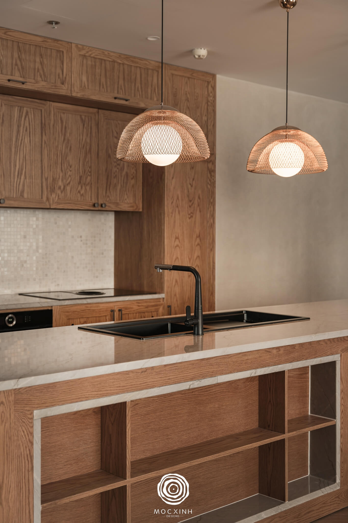 Song, để tiết chế cảm giác nặng nề từ gỗ, không gian nấu nướng được trang bị hệ đèn trang trí tinh tế và ấm cúng làm tăng vẻ tươi sáng cho gian bếp.