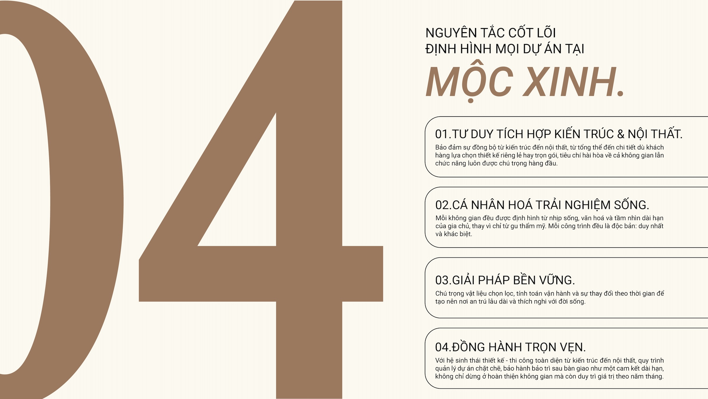 “Nhà là nơi con người cảm thấy được bảo vệ và bình an. Với Mộc Xinh, thiết kế không chỉ là tạo nên hình thức, mà là hành trình giúp gia chủ tìm lại sự kết nối với chính mình.”